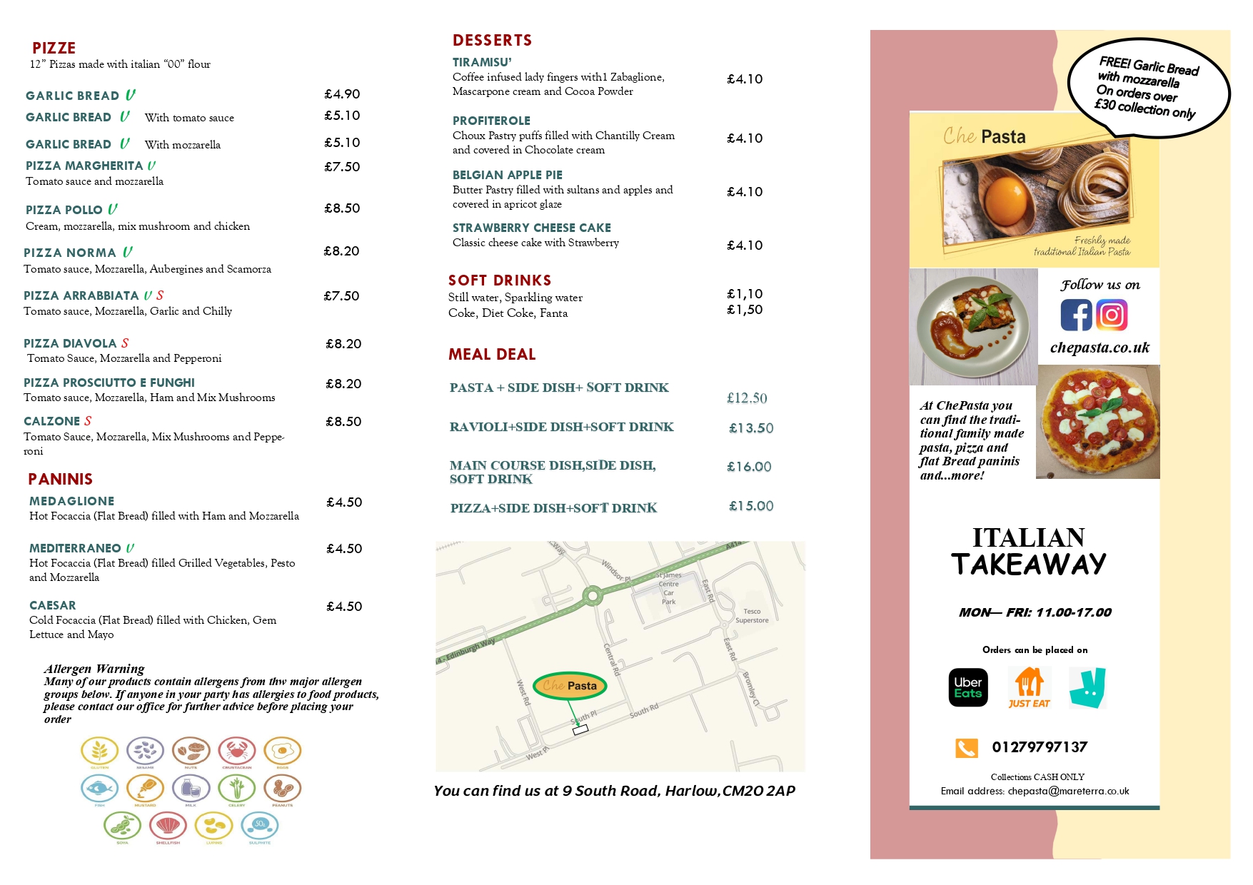 Order can be placed on: Deliveroo, Just eat or by calling 01279 797 137